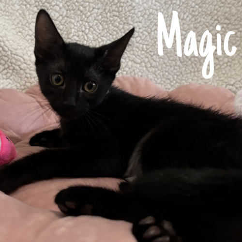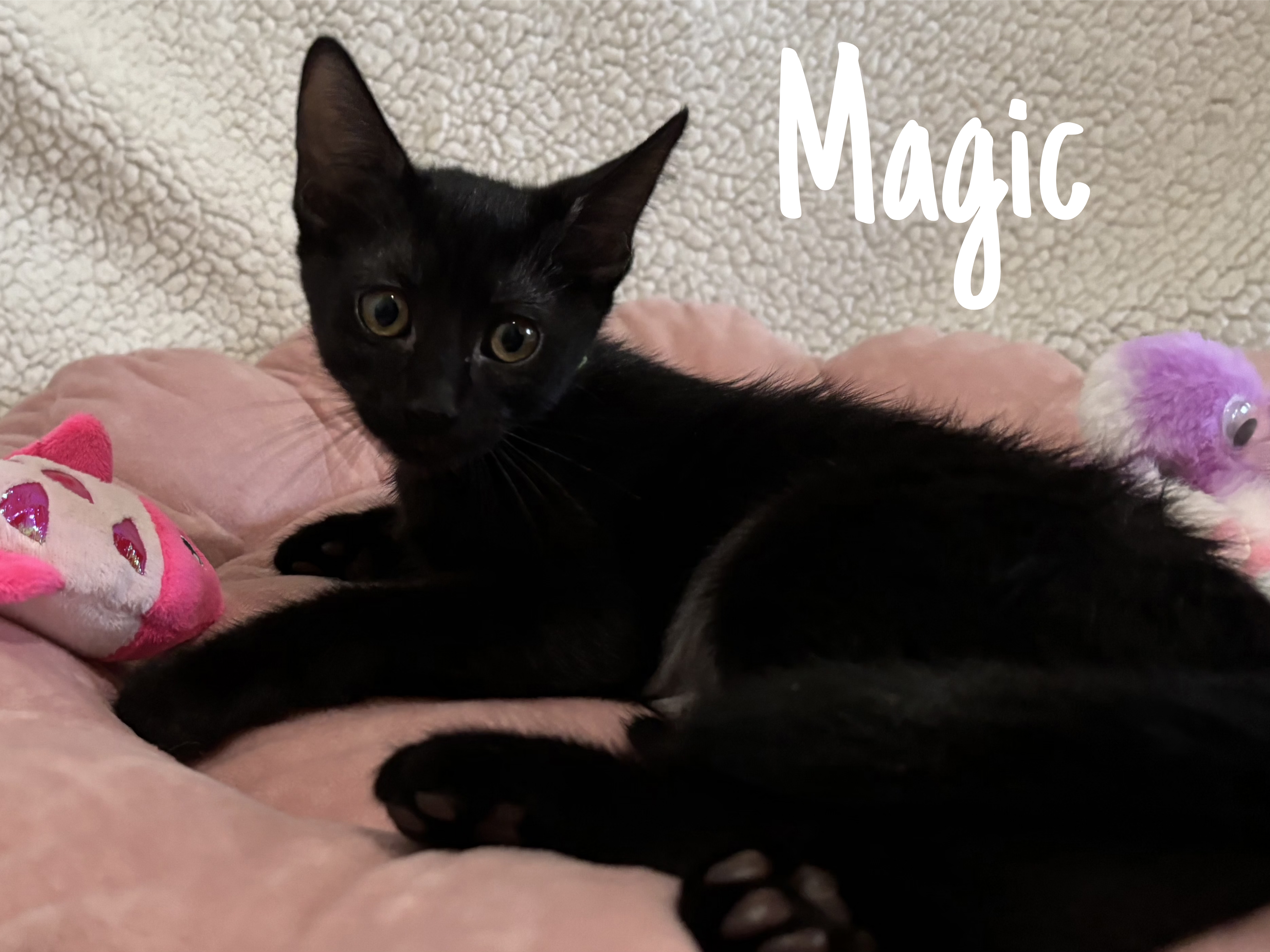 Magic is a sweet kitten who loves to play. She might be a little shy at first but it wont take long for her to get used to a new home.