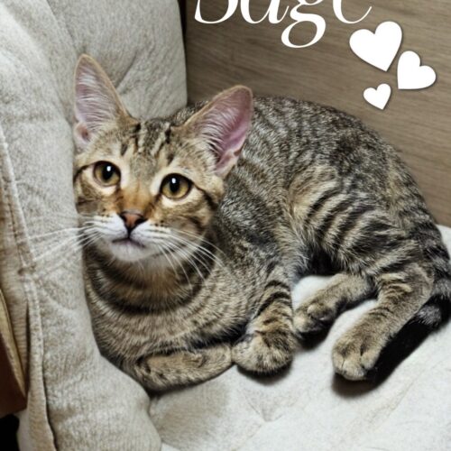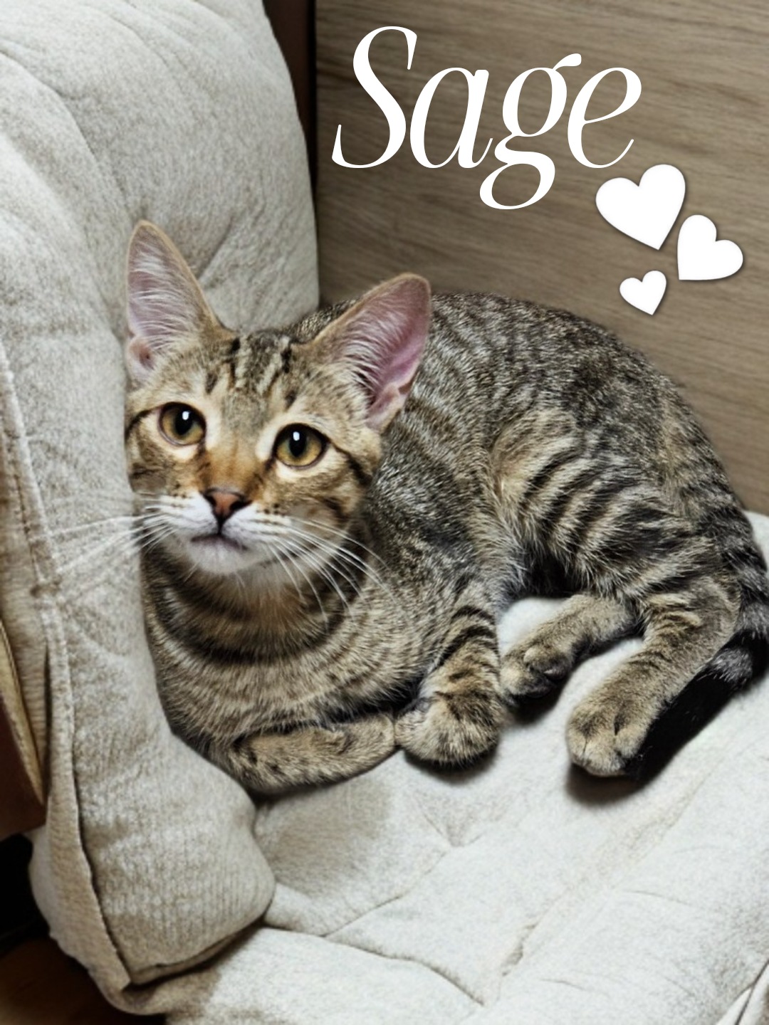 Sage is an adventurer. He runs and jumps all over the cat tree. Sage loves to play with the other kittens. He is to busy for lap time but he doesn't mind some tummy time. He does like to snuggle with you at bed time. He does great with other cats and dogs.
